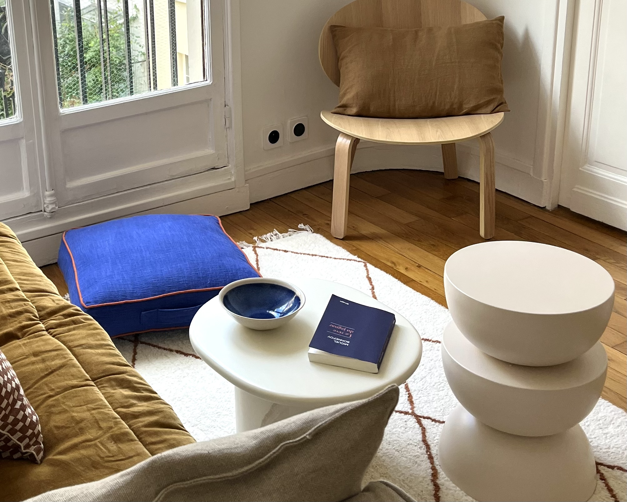 Dans cet appartement Art Déco du XVe arrondissement de Paris, la pièce de vie principale de 13 m² devait faire office de salon et de salle à manger. L’enjeu consistait ici à fluidifier au maximum la circulation et à tirer parti de chaque recoin pour créer deux espaces distincts. Chaque élément est étudié pour occuper le moins de place possible. Une banquette et une table sur mesure ont été créées pour la partie repas, et du mobilier nomade a été choisi pour plus de praticité.