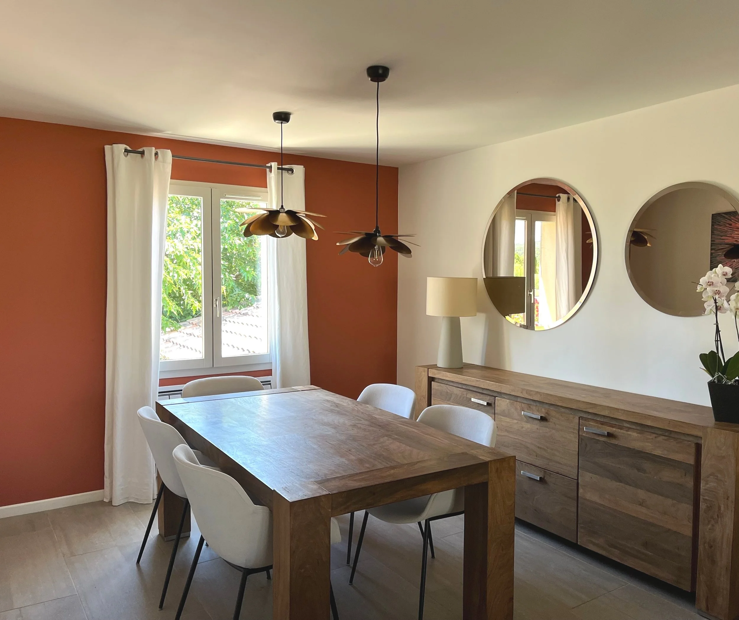 Les murs ont été repeints dans un blanc crème de chez Ressource et rehaussés par le Terracotta pour le mur du fond de la salle à manger. Cette mise en peinture a permis d’élargir visuellement cette pièce très en longueur.