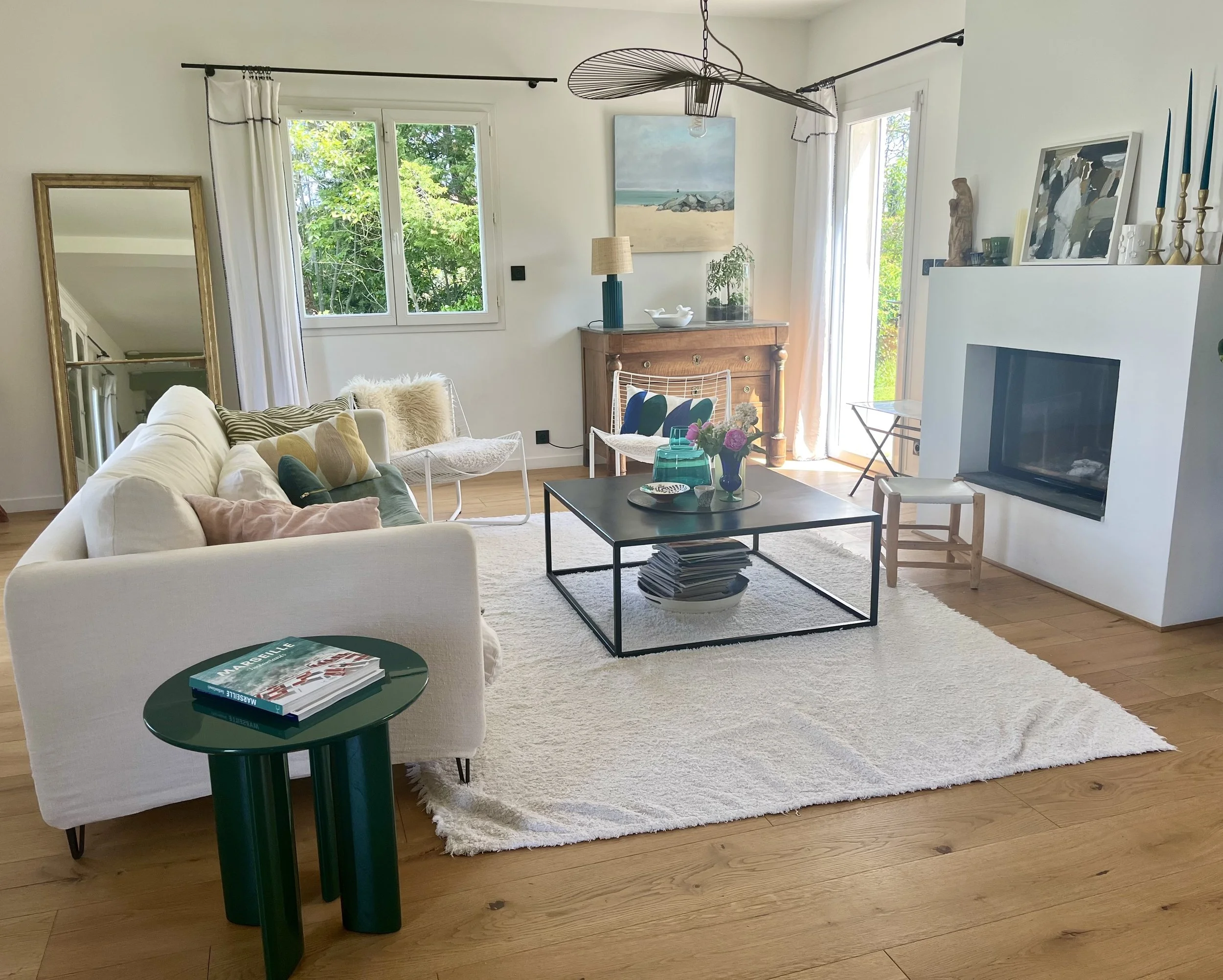 Le cahier des charges : Donner une ligne plus contemporaine aux pièces de vie et améliorer la fluidité dans l’espace. Apporter une unité décorative à l’ensemble dans des tonalités de bleu et de vert.